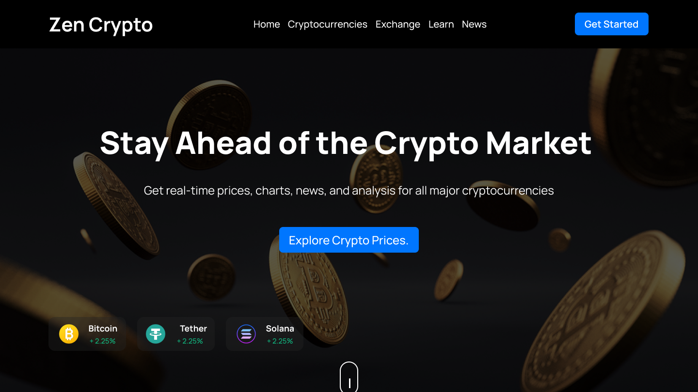Zen Crypto is a website UI design project for a platform showcasing cryptocurrency prices, markets, charts, and news. On the other hand, users can find educative information on how to get started with cryptocurrency.